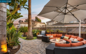 Tucked away in the highly sought-after, gated community of Vista Pointe Canyon Lakes, this beautiful duet offers resort-style living with the nearby Canyon Lakes Golf Course and a lush, tropical backyard featuring paver patios, a fire pit, and vibrant landscaping with palms and birds of paradise. Inside, travertine tiles and an open concept floor plan connect the living room and dining area, highlighted by French doors with a phantom screen leading to the backyard. The kitchen is meticulously maintained with stainless steel appliances, granite countertops, custom backsplash, ample cabinetry, and a sunny breakfast nook. The spacious primary suite boasts vaulted ceilings, a walk-in closet with built-ins, dual sinks, a walk-in shower, and a jetted tub. Upstairs, find two secondary bedrooms (one converted into a loft), a shared hallway bath, and a convenient laundry room. Additional features include a garage with epoxy floors and custom built-ins. Located near top-rated San Ramon Valley schools, shopping, dining, and Canyon Lakes Golf Course, this home combines comfort, style, and an unbeatable location.